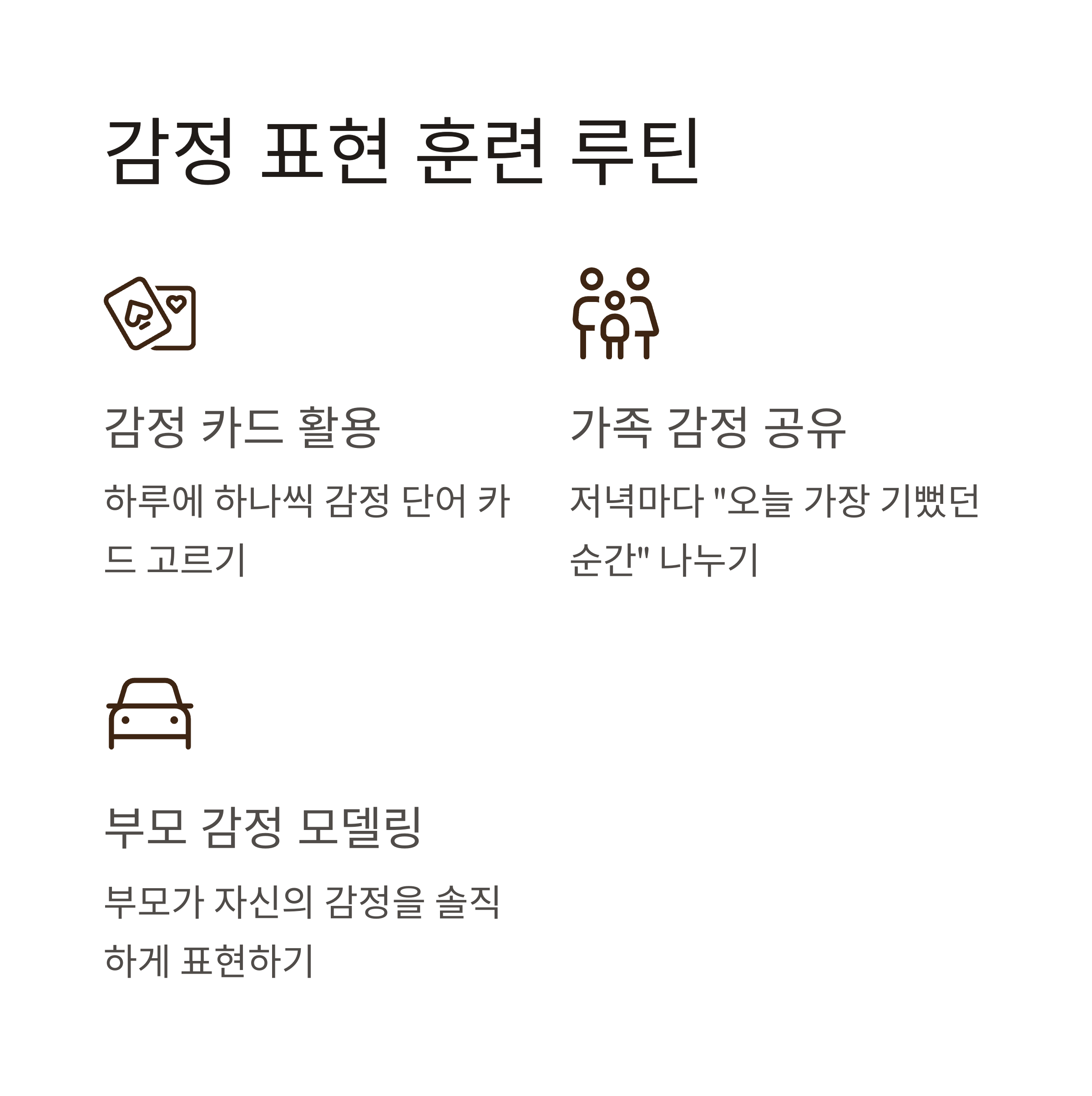 | 부모 감정 모델링 | 부모가 자신의 감정을 솔직하게 말하는 모습 자주 보여주기 |