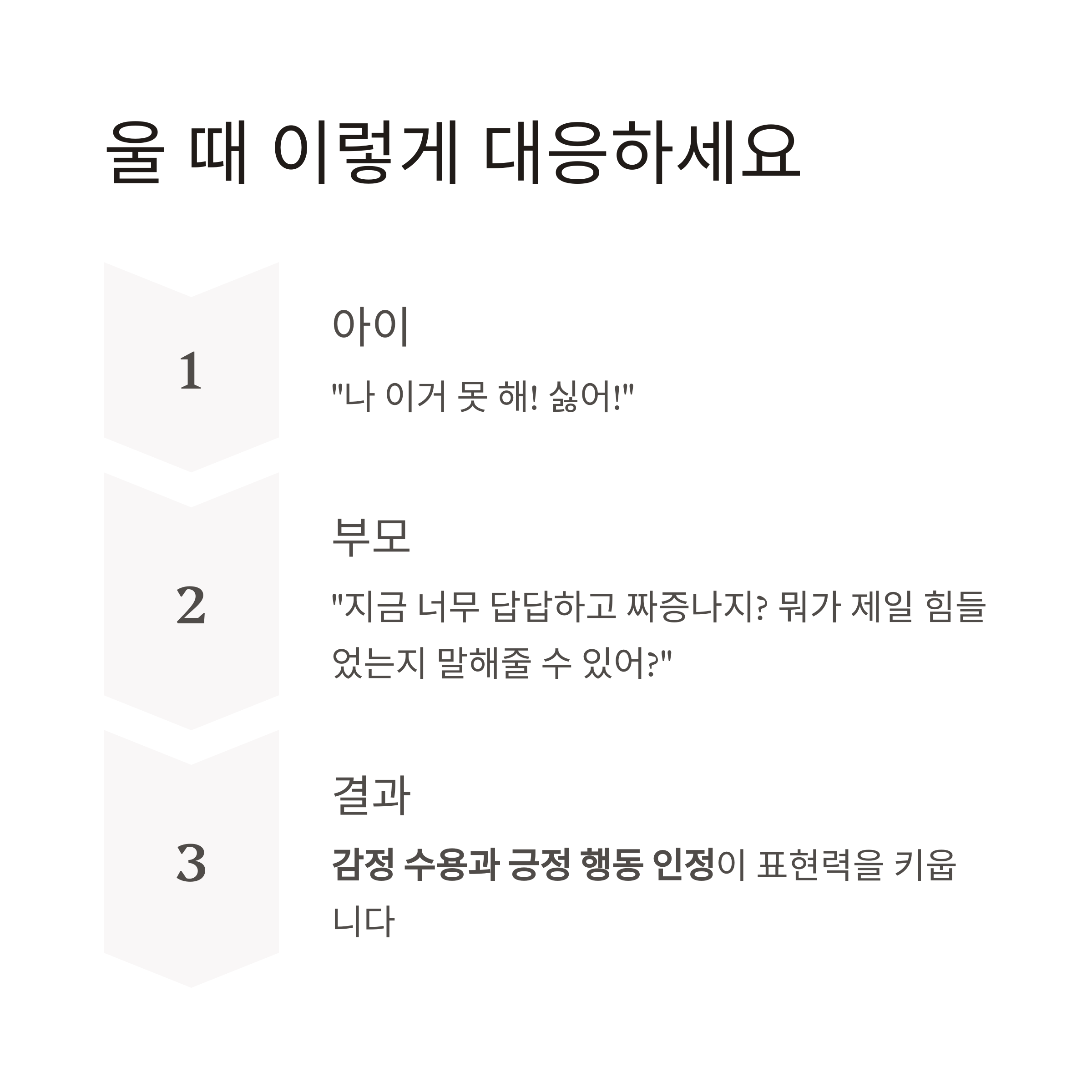 아이: (울면서) "나 이거 못 해! 싫어!"
