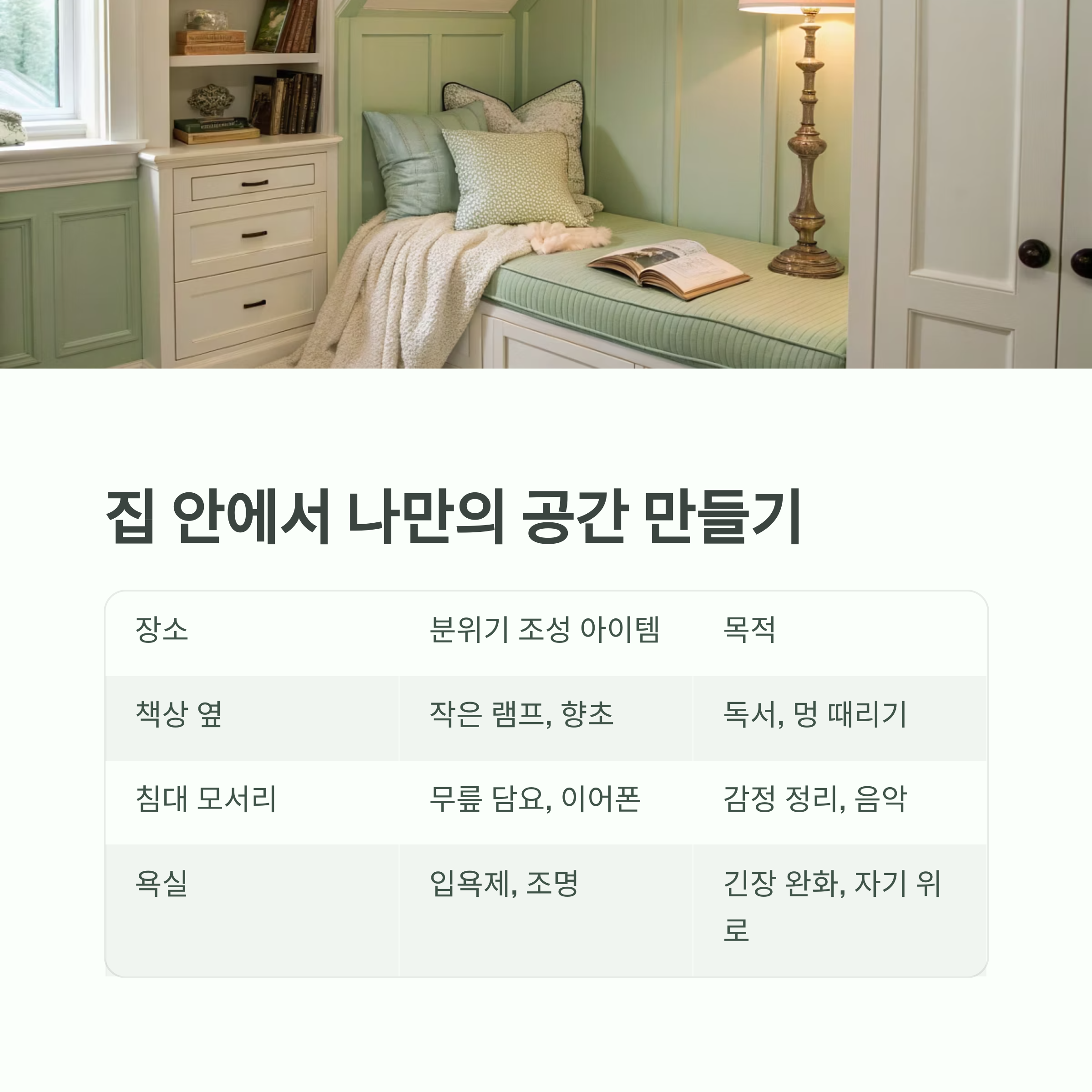 장소 분위기 조성 아이템 목적 책상 옆 작은 램프 아래 조용한 음악, 향초 짧은 독서나 멍 때리기 침대 모서리 공간 무릎 담요, 이어폰 감정 정리, 음악 듣기 욕실 속 반신욕 공간 입욕제, 조명 등 긴장 완화, 자기 위로